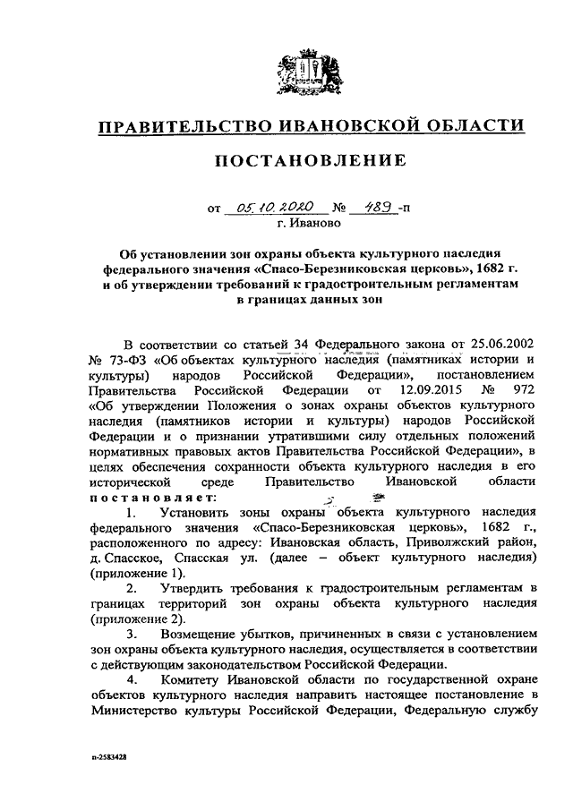 Постановление Правительства Ивановской области от 05.10.2020 N 489-п "Об установлении зон охраны объекта культурного наследия федерального значения "Спасо-Березниковская церковь", 1682 г., и об утверждении требований к градостроительным регламентам в границах данных зон" (вместе со "Схемой зон охраны объекта культурного наследия", "Требованиями к градостроительным регламентам в границах территорий зон охраны объекта культурного наследия федерального значения "Спасо-Березниковская церковь", 1682 г., расположенного по адресу: Ивановская область, Приволжский район, д. Спасское, Спасская ул.")