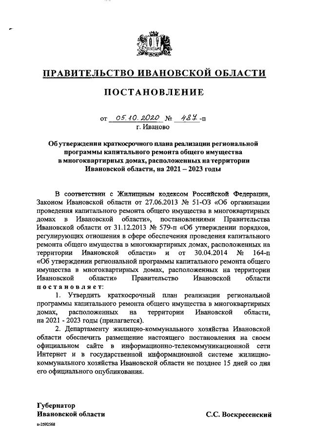 Постановление Правительства Ивановской области от 05.10.2020 N 487-п "Об утверждении краткосрочного плана реализации региональной программы капитального ремонта общего имущества в многоквартирных домах, расположенных на территории Ивановской области, на 2021 - 2023 годы"