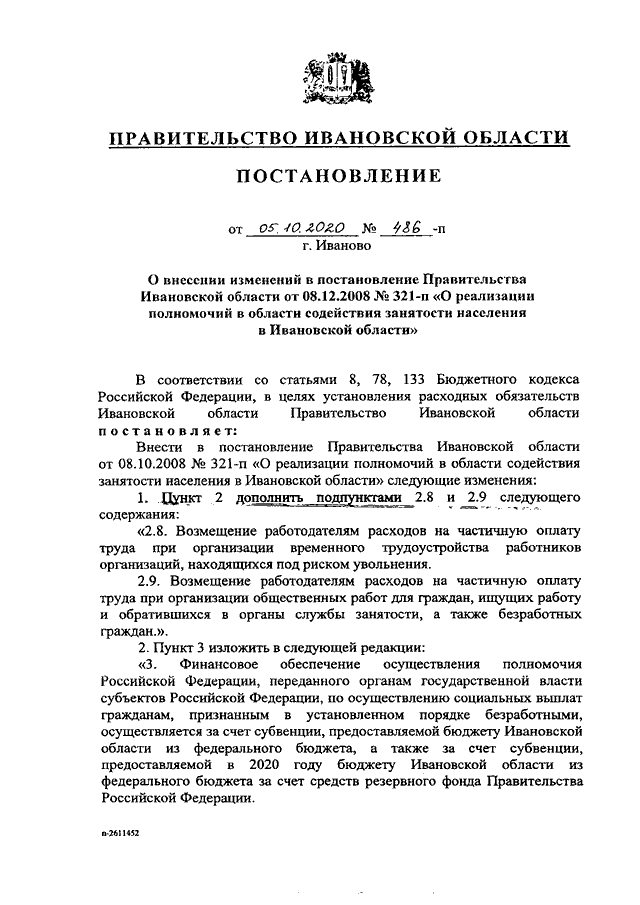 Постановление Правительства Ивановской области от 05.10.2020 N 486-п "О внесении изменений в постановление Правительства Ивановской области от 08.12.2008 N 321-п "О реализации полномочий в области содействия занятости населения в Ивановской области"
