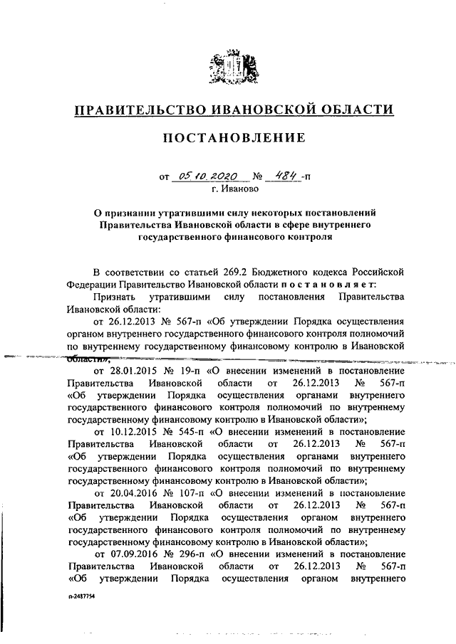 Постановление Правительства Ивановской области от 05.10.2020 N 484-п "О признании утратившими силу некоторых постановлений Правительства Ивановской области в сфере внутреннего государственного финансового контроля"