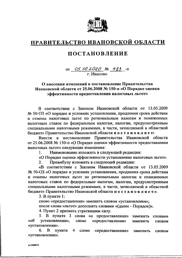 Постановление Правительства Ивановской области от 05.10.2020 N 483-п "О внесении изменений в постановление Правительства Ивановской области от 25.06.2008 N 150-п "О Порядке оценки эффективности предоставления налоговых льгот" (вместе с "Порядком оценки эффективности установления налоговых льгот")