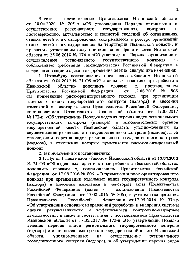 Постановление Правительства Ивановской области от 05.10.2020 N 478-п "О внесении изменений в постановление Правительства Ивановской области от 30.04.2020 N 205-п "Об утверждении Порядка организации и осуществления регионального государственного контроля за достоверностью, актуальностью и полнотой сведений об организациях отдыха детей и их оздоровления, содержащихся в реестре организаций отдыха детей и их оздоровления на территории Ивановской области, и признании утратившим силу постановления Правительства Ивановской области от 25.06.2018 N 176-п "Об утверждении Порядка организации и осуществления регионального государственного контроля за соблюдением требований законодательства Российской Федерации в сфере организации отдыха и оздоровления детей"