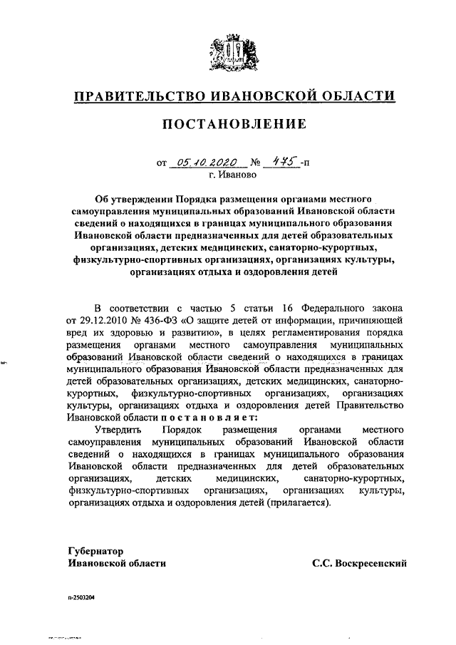 Постановление Правительства Ивановской области от 05.10.2020 N 475-п "Об утверждении Порядка размещения органами местного самоуправления муниципальных образований Ивановской области сведений о находящихся в границах муниципального образования Ивановской области предназначенных для детей образовательных организациях, детских медицинских, санаторно-курортных, физкультурно-спортивных организациях, организациях культуры, организациях отдыха и оздоровления детей"