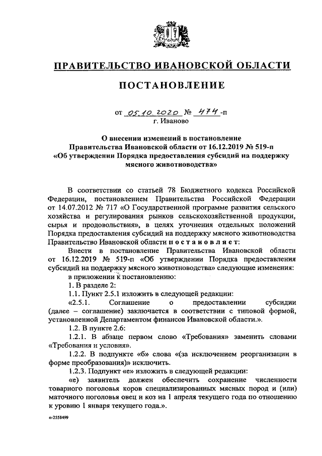 Постановление Правительства Ивановской области от 05.10.2020 N 474-п "О внесении изменений в постановление Правительства Ивановской области от 16.12.2019 N 519-п "Об утверждении Порядка предоставления субсидий на поддержку мясного животноводства"