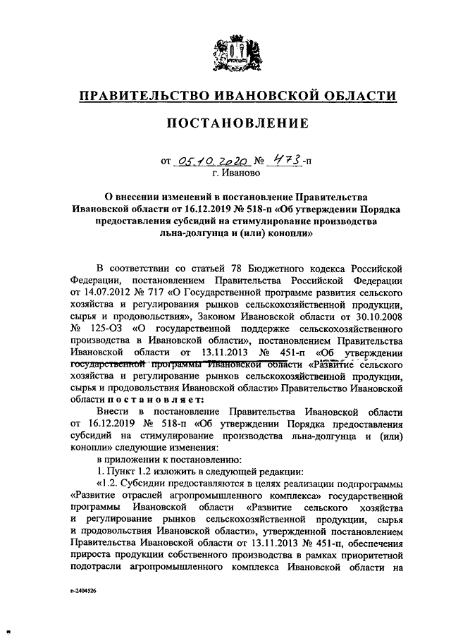 Постановление Правительства Ивановской области от 05.10.2020 N 473-п "О внесении изменений в постановление Правительства Ивановской области от 16.12.2019 N 518-п "Об утверждении Порядка предоставления субсидий на стимулирование производства льна-долгунца и (или) конопли"