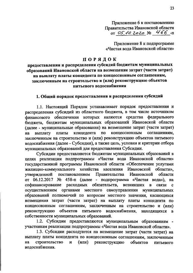 Постановление Правительства Ивановской области от 05.10.2020 N 466-п "О внесении изменений в постановление Правительства Ивановской области от 06.12.2017 N 458-п "Об утверждении государственной программы Ивановской области "Обеспечение услугами жилищно-коммунального хозяйства населения Ивановской области" (вместе с "Порядком предоставления и распределения субсидий бюджетам муниципальных образований Ивановской области на возмещение затрат (части затрат) на выплату платы концедента по концессионным соглашениям, заключенным на строительство и (или) реконструкцию объектов питьевого водоснабжения")