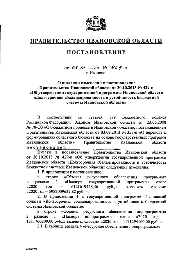 Постановление Правительства Ивановской области от 05.10.2020 N 464-п "О внесении изменений в постановление Правительства Ивановской области от 30.10.2013 N 429-п "Об утверждении государственной программы Ивановской области "Долгосрочная сбалансированность и устойчивость бюджетной системы Ивановской области"