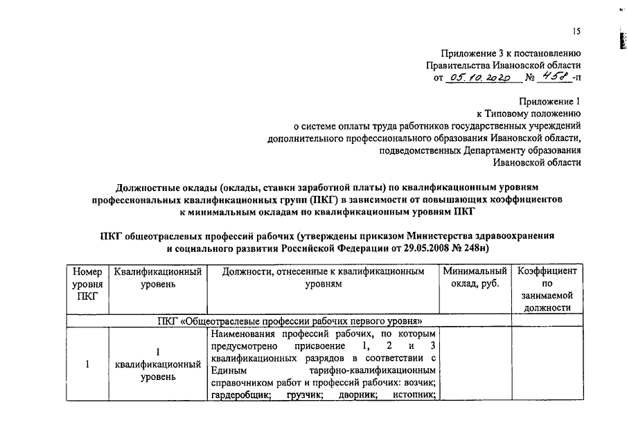 Постановление Правительства Ивановской области от 05.10.2020 N 458-п "О внесении изменений в постановление Правительства Ивановской области от 31.12.2008 N 371-п "О системе оплаты труда работников государственных учреждений Ивановской области, подведомственных Департаменту образования Ивановской области"