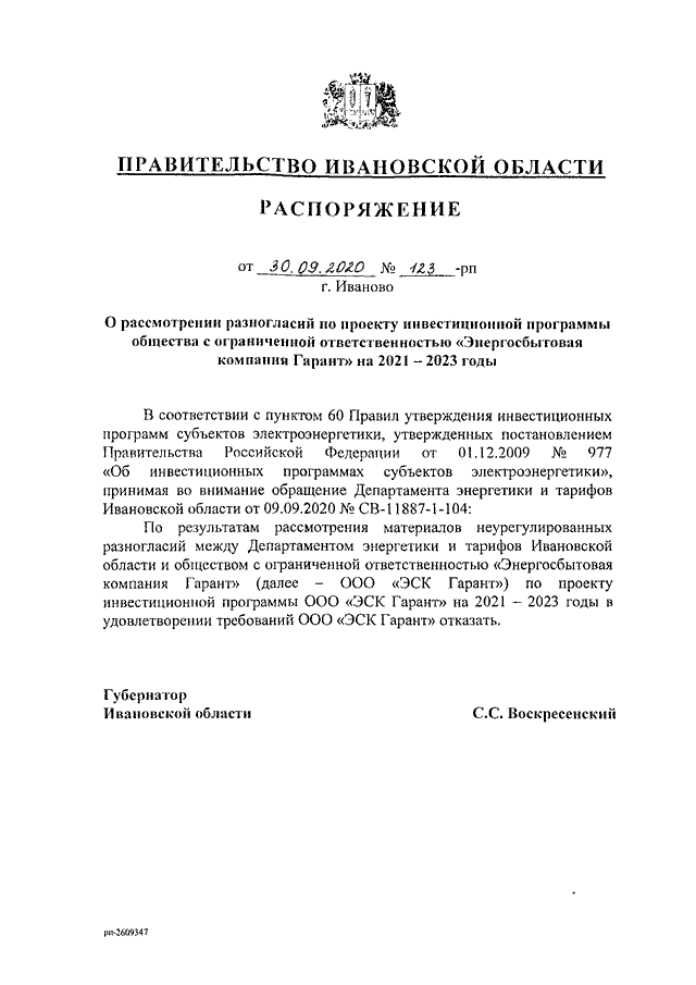 Распоряжение Правительства Ивановской области от 30.09.2020 N 123-рп "О рассмотрении разногласий по проекту инвестиционной программы общества с ограниченной ответственностью "Энергосбытовая компания Гарант" на 2021 - 2023 годы"