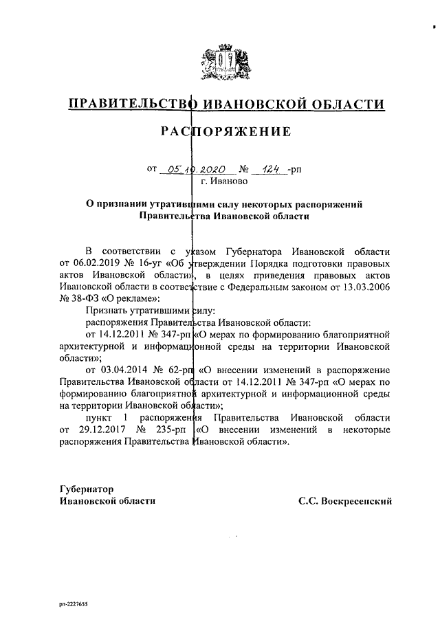 Распоряжение Правительства Ивановской области от 05.10.2020 N 124-рп "О признании утратившими силу некоторых распоряжений Правительства Ивановской области"