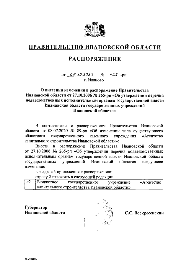 Распоряжение Правительства Ивановской области от 05.10.2020 N 125-рп "О внесении изменения в распоряжение Правительства Ивановской области от 27.10.2006 N 265-рп "Об утверждении перечня подведомственных исполнительным органам государственной власти Ивановской области государственных учреждений Ивановской области"