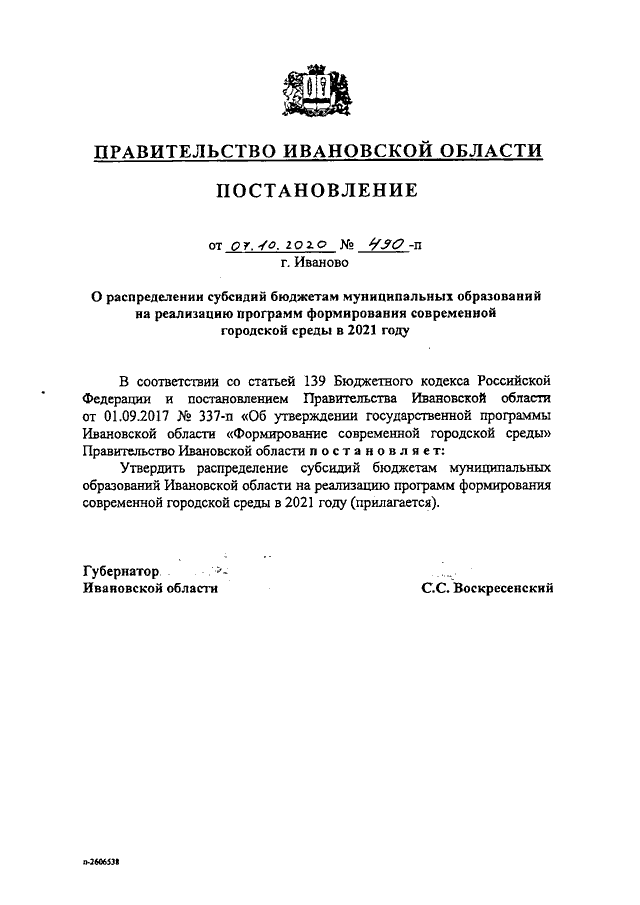 Постановление Правительства Ивановской области от 07.10.2020 N 490-п "О распределении субсидий бюджетам муниципальных образований на реализацию программ формирования современной городской среды в 2021 году"