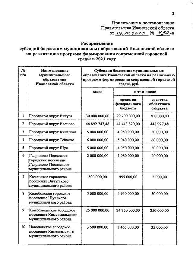 Постановление Правительства Ивановской области от 07.10.2020 N 490-п "О распределении субсидий бюджетам муниципальных образований на реализацию программ формирования современной городской среды в 2021 году"