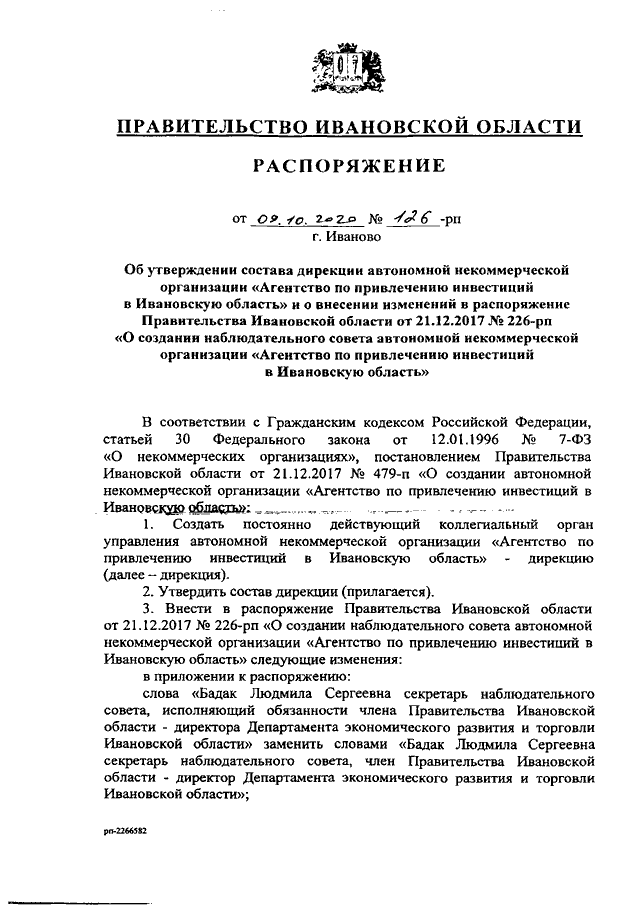 Распоряжение Правительства Ивановской области от 09.10.2020 N 126-рп "Об утверждении состава дирекции автономной некоммерческой организации "Агентство по привлечению инвестиций в Ивановскую область" и о внесении изменений в распоряжение Правительства Ивановской области от 21.12.2017 N 226-рп "О создании наблюдательного совета автономной некоммерческой организации "Агентство по привлечению инвестиций в Ивановскую область"