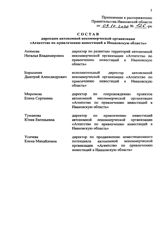 Распоряжение Правительства Ивановской области от 09.10.2020 N 126-рп "Об утверждении состава дирекции автономной некоммерческой организации "Агентство по привлечению инвестиций в Ивановскую область" и о внесении изменений в распоряжение Правительства Ивановской области от 21.12.2017 N 226-рп "О создании наблюдательного совета автономной некоммерческой организации "Агентство по привлечению инвестиций в Ивановскую область"