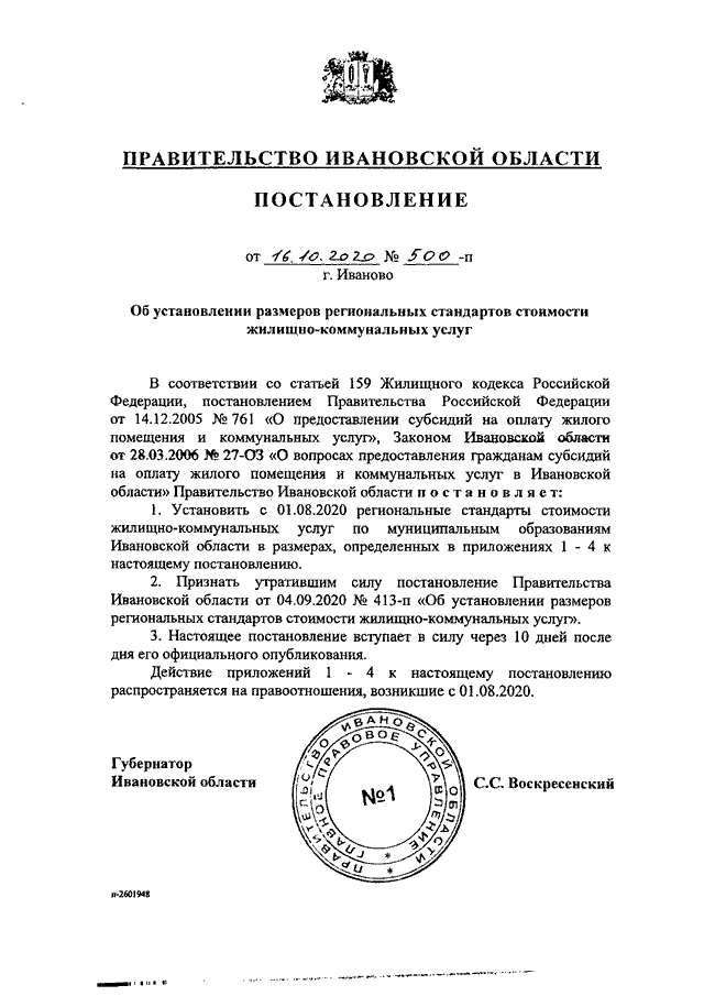 Постановление Правительства Ивановской области от 16.10.2020 N 500-п "Об установлении размеров региональных стандартов стоимости жилищно-коммунальных услуг"
