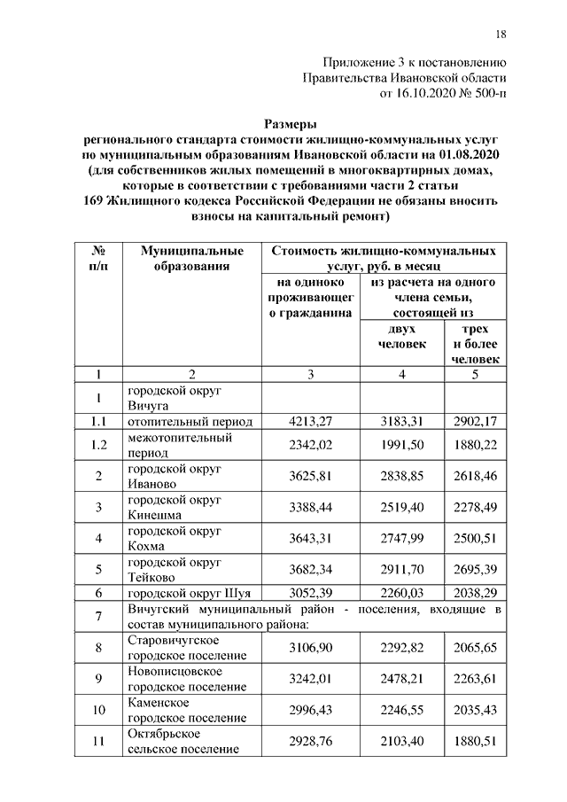 Постановление Правительства Ивановской области от 16.10.2020 N 500-п "Об установлении размеров региональных стандартов стоимости жилищно-коммунальных услуг"