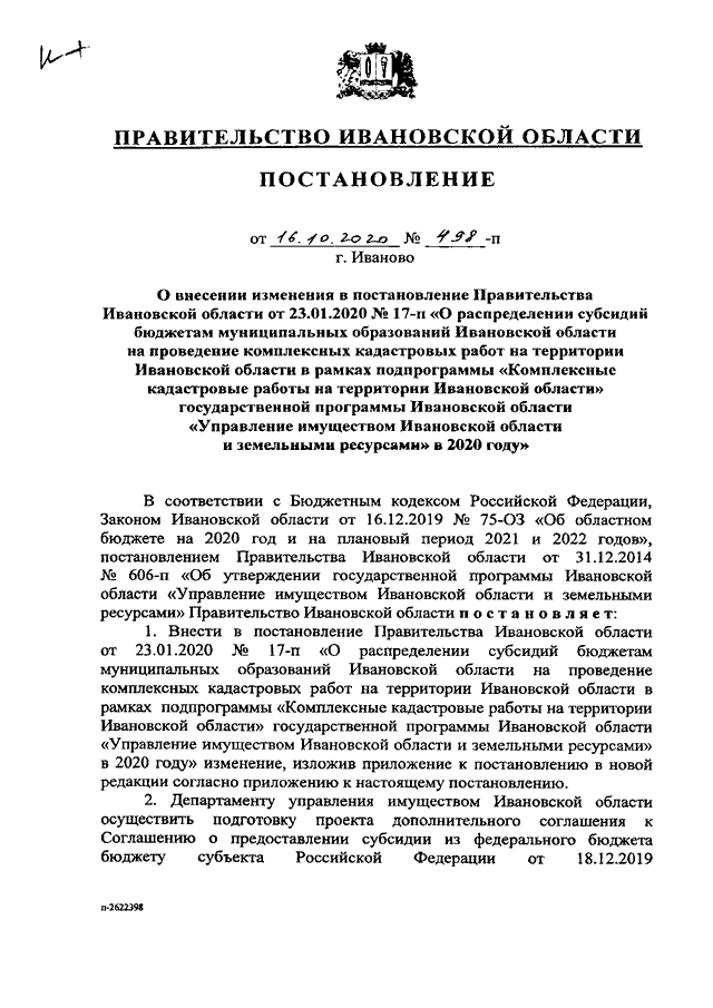 Постановление Правительства Ивановской области от 16.10.2020 N 498-п "О внесении изменения в постановление Правительства Ивановской области от 23.01.2020 N 17-п "О распределении субсидий бюджетам муниципальных образований Ивановской области на проведение комплексных кадастровых работ на территории Ивановской области в рамках подпрограммы "Комплексные кадастровые работы на территории Ивановской области" государственной программы Ивановской области "Управление имуществом Ивановской области и земельными ресурсами" в 2020 году"