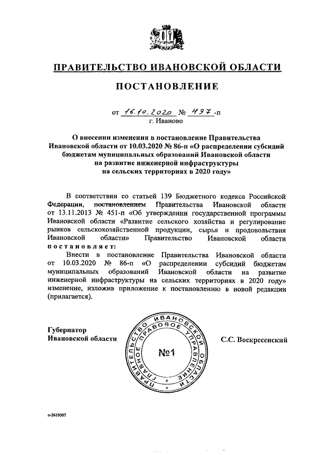 Постановление Правительства Ивановской области от 16.10.2020 N 497-п "О внесении изменения в постановление Правительства Ивановской области от 10.03.2020 N 86-п "О распределении субсидий бюджетам муниципальных образований Ивановской области на развитие инженерной инфраструктуры на сельских территориях в 2020 году"