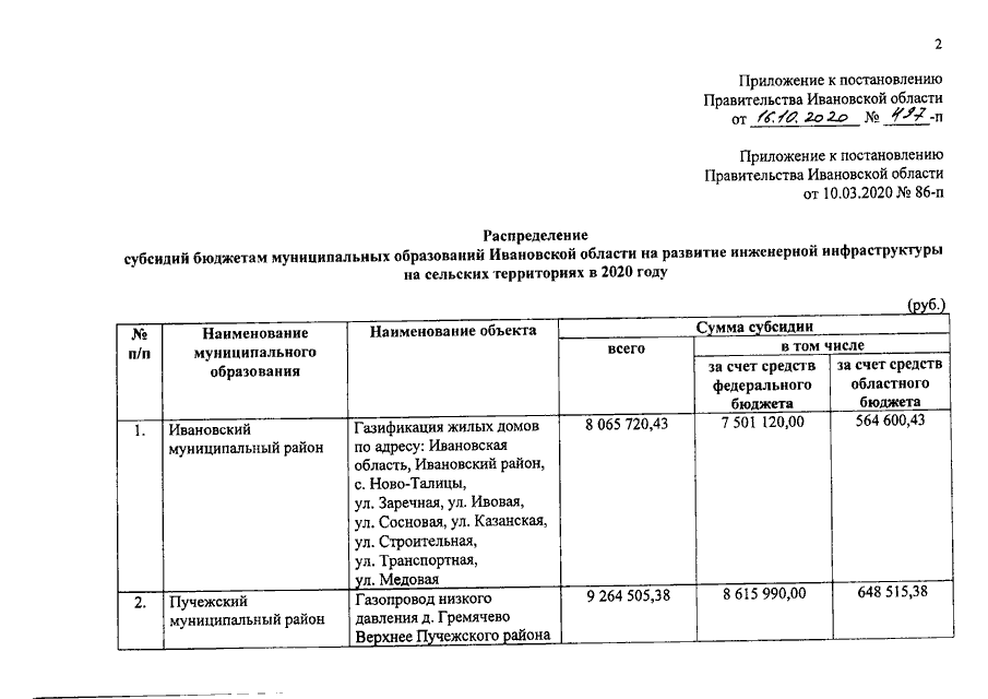 Постановление Правительства Ивановской области от 16.10.2020 N 497-п "О внесении изменения в постановление Правительства Ивановской области от 10.03.2020 N 86-п "О распределении субсидий бюджетам муниципальных образований Ивановской области на развитие инженерной инфраструктуры на сельских территориях в 2020 году"