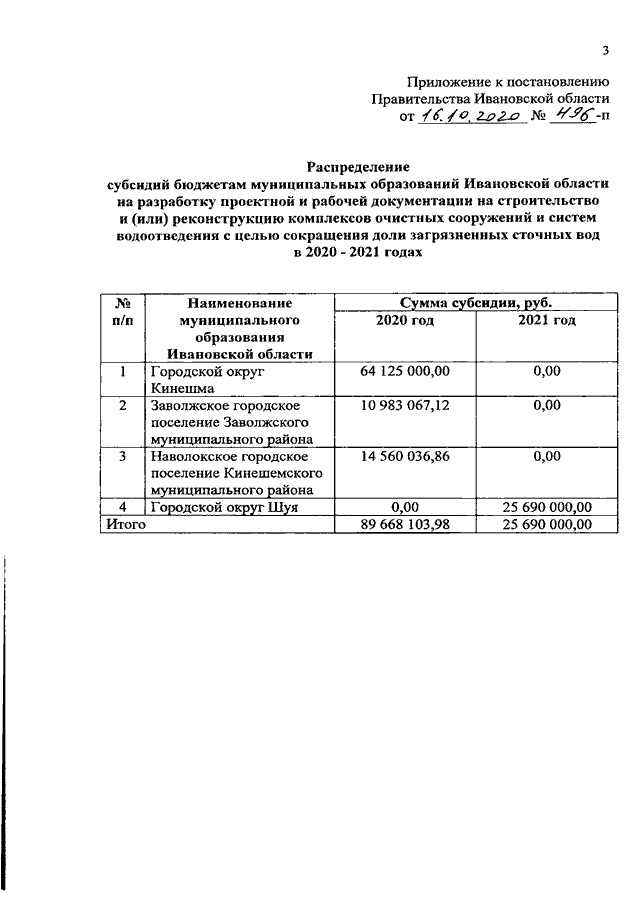 Постановление Правительства Ивановской области от 16.10.2020 N 496-п "О внесении изменения в постановление Правительства Ивановской области от 03.02.2020 N 32-п "О распределении субсидий бюджетам муниципальных образований Ивановской области на разработку проектной и рабочей документации на строительство и (или) реконструкцию комплексов очистных сооружений и систем водоотведения с целью сокращения доли загрязненных сточных вод в 2020 - 2021 годах и признании утратившим силу постановления Правительства Ивановской области от 22.08.2019 N 326-п "О распределении субсидий бюджетам муниципальных образований Ивановской области на разработку проектной и рабочей документации на строительство и (или) реконструкцию комплексов очистных сооружений и систем водоотведения с целью сокращения доли загрязненных сточных вод в 2019 году"
