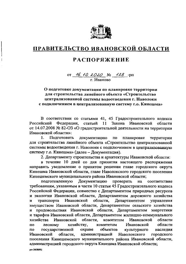 Распоряжение Правительства Ивановской области от 16.10.2020 N 128-рп "О подготовке Документации по планировке территории для строительства линейного объекта "Строительство централизованной системы водоотведения г. Наволоки с подключением в централизованную систему г.о. Кинешма"