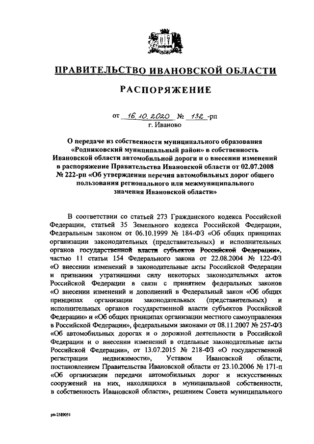 Распоряжение Правительства Ивановской области от 16.10.2020 N 132-рп "О передаче из собственности муниципального образования "Родниковский муниципальный район" в собственность Ивановской области автомобильной дороги и о внесении изменений в распоряжение Правительства Ивановской области от 02.07.2008 N 222-рп "Об утверждении перечня автомобильных дорог общего пользования регионального или межмуниципального значения Ивановской области" (вместе с "Перечнем имущества, передаваемого из собственности муниципального образования "Родниковский муниципальный район" в собственность Ивановской области")