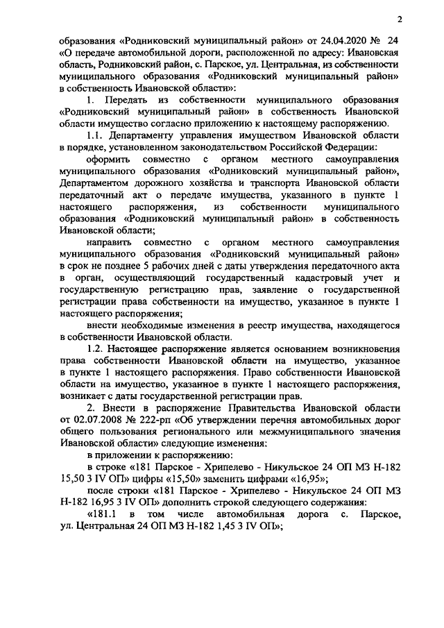 Распоряжение Правительства Ивановской области от 16.10.2020 N 132-рп "О передаче из собственности муниципального образования "Родниковский муниципальный район" в собственность Ивановской области автомобильной дороги и о внесении изменений в распоряжение Правительства Ивановской области от 02.07.2008 N 222-рп "Об утверждении перечня автомобильных дорог общего пользования регионального или межмуниципального значения Ивановской области" (вместе с "Перечнем имущества, передаваемого из собственности муниципального образования "Родниковский муниципальный район" в собственность Ивановской области")