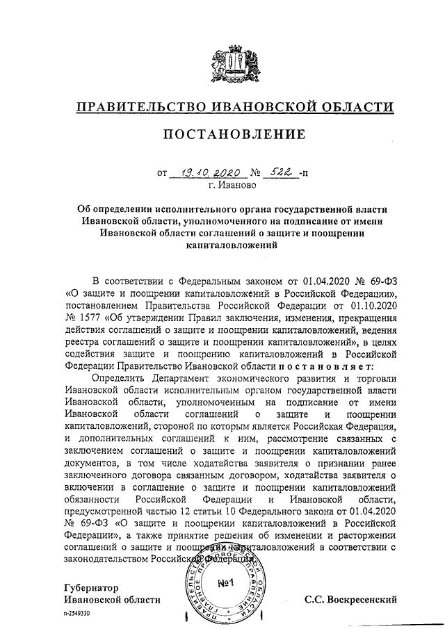 Постановление Правительства Ивановской области от 19.10.2020 N 522-п "Об определении исполнительного органа государственной власти Ивановской области, уполномоченного на подписание от имени Ивановской области соглашений о защите и поощрении капиталовложений"