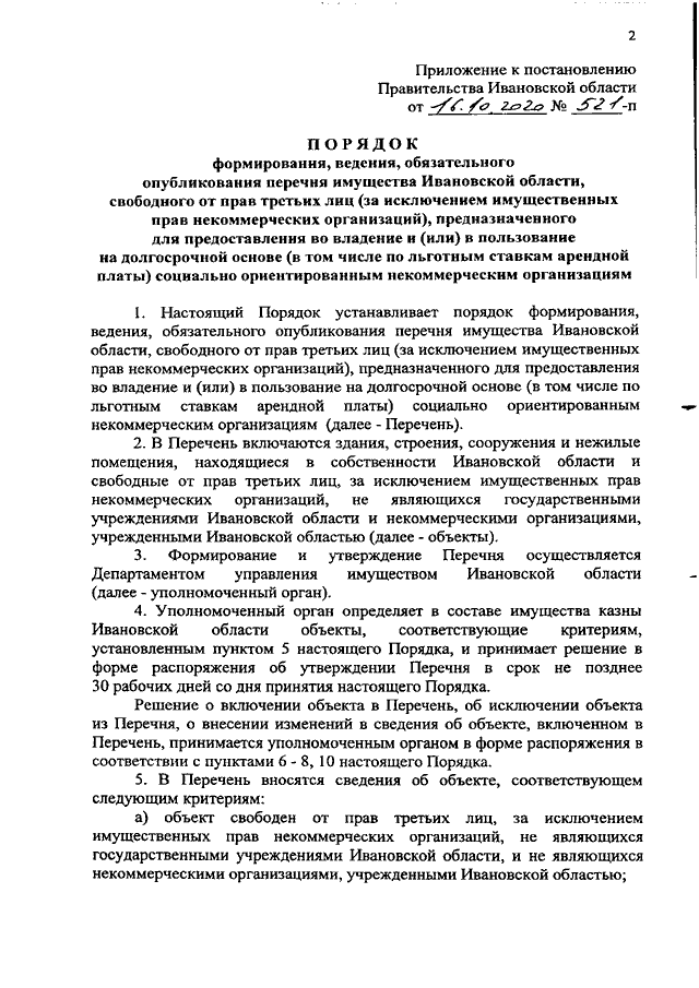 Постановление Правительства Ивановской области от 16.10.2020 N 521-п "Об утверждении Порядка формирования, ведения, обязательного опубликования перечня имущества Ивановской области, свободного от прав третьих лиц (за исключением имущественных прав некоммерческих организаций), предназначенного для предоставления во владение и (или) в пользование на долгосрочной основе (в том числе по льготным ставкам арендной платы) социально ориентированным некоммерческим организациям"