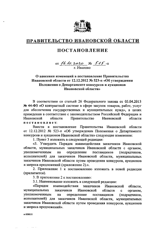 Постановление Правительства Ивановской области от 16.10.2020 N 515-п "О внесении изменений в постановление Правительства Ивановской области от 12.12.2012 N 523-п "Об утверждении положения о Департаменте конкурсов и аукционов Ивановской области"