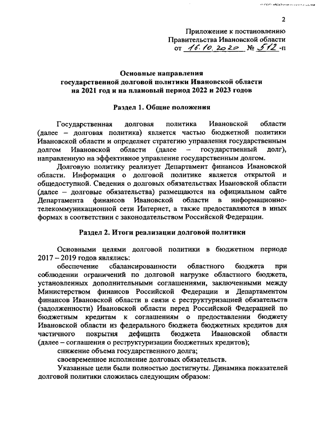 Постановление Правительства Ивановской области от 16.10.2020 N 512-п "Об утверждении основных направлений государственной долговой политики Ивановской области на 2021 год и на плановый период 2022 и 2023 годов"