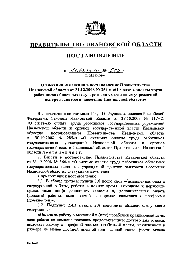 Постановление Правительства Ивановской области от 16.10.2020 N 509-п "О внесении изменений в постановление Правительства Ивановской области от 31.12.2008 N 364-п "О системе оплаты труда работников областных государственных казенных учреждений центров занятости населения Ивановской области"