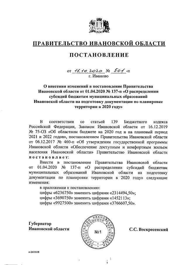 Постановление Правительства Ивановской области от 16.10.2020 N 501-п "О внесении изменений в постановление Правительства Ивановской области от 01.04.2020 N 137-п "О распределении субсидий бюджетам муниципальных образований Ивановской области на подготовку документации по планировке территории в 2020 году"