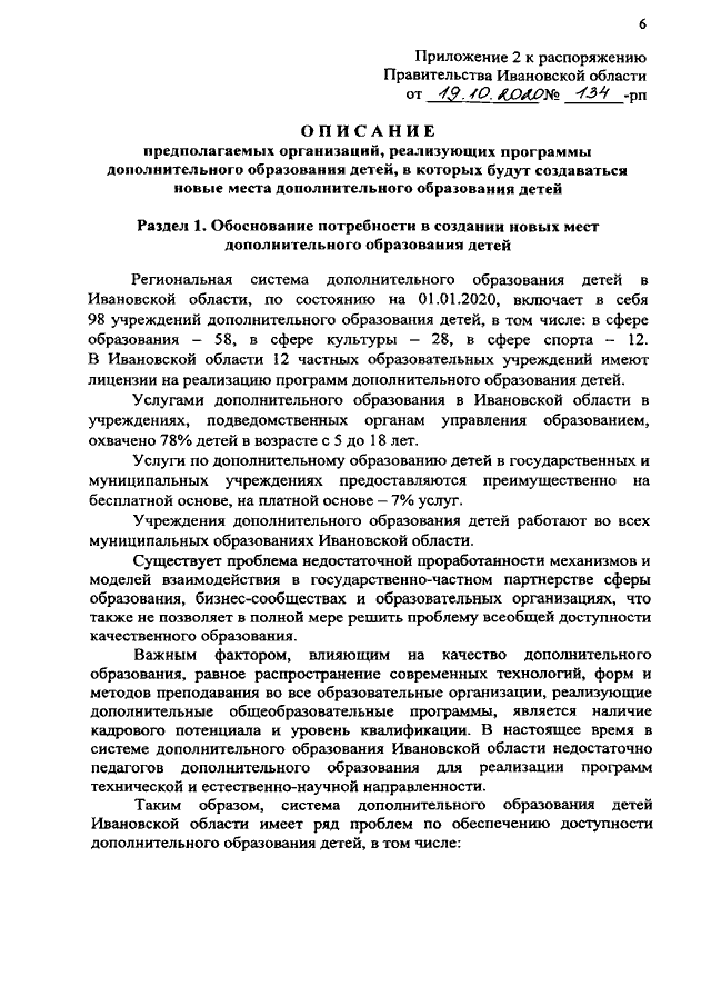 Распоряжение Правительства Ивановской области от 19.10.2020 N 134-рп "О концепции создания новых мест в образовательных организациях различных типов для реализации дополнительных общеразвивающих программ всех направленностей в рамках федерального проекта "Успех каждого ребенка" национального проекта "Образование" на 2022 - 2023 годы"