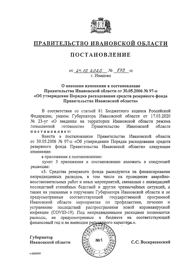 Постановление Правительства Ивановской области от 24.10.2020 N 539-п "О внесении изменения в постановление Правительства Ивановской области от 30.05.2006 N 97-п "Об утверждении Порядка расходования средств резервного фонда Правительства Ивановской области"