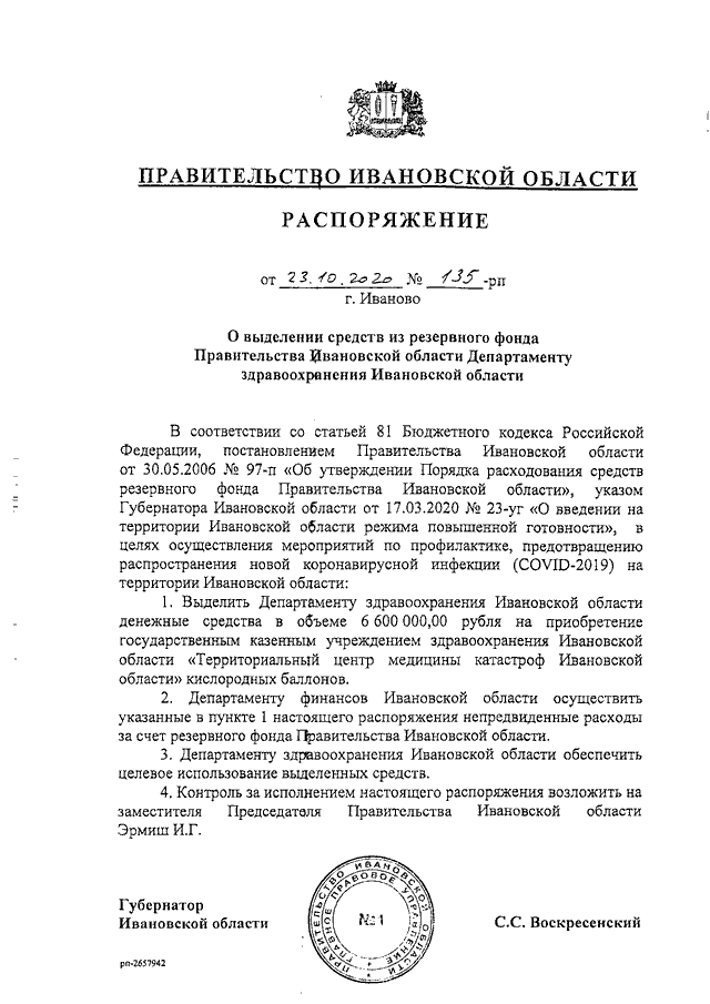 Распоряжение Правительства Ивановской области от 23.10.2020 N 135-рп "О выделении средств из резервного фонда Правительства Ивановской области Департаменту здравоохранения Ивановской области"