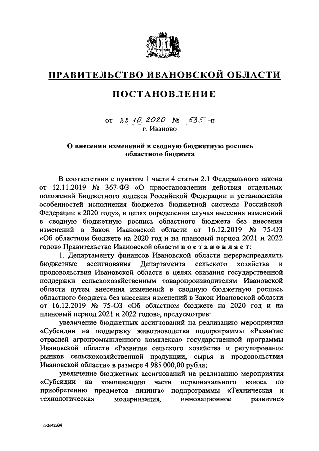 Постановление Правительства Ивановской области от 23.10.2020 N 535-п "О внесении изменений в сводную бюджетную роспись областного бюджета"