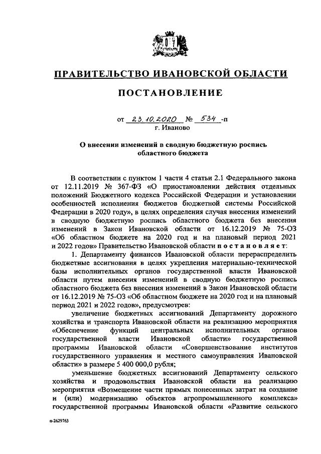 Постановление Правительства Ивановской области от 23.10.2020 N 534-п "О внесении изменений в сводную бюджетную роспись областного бюджета"