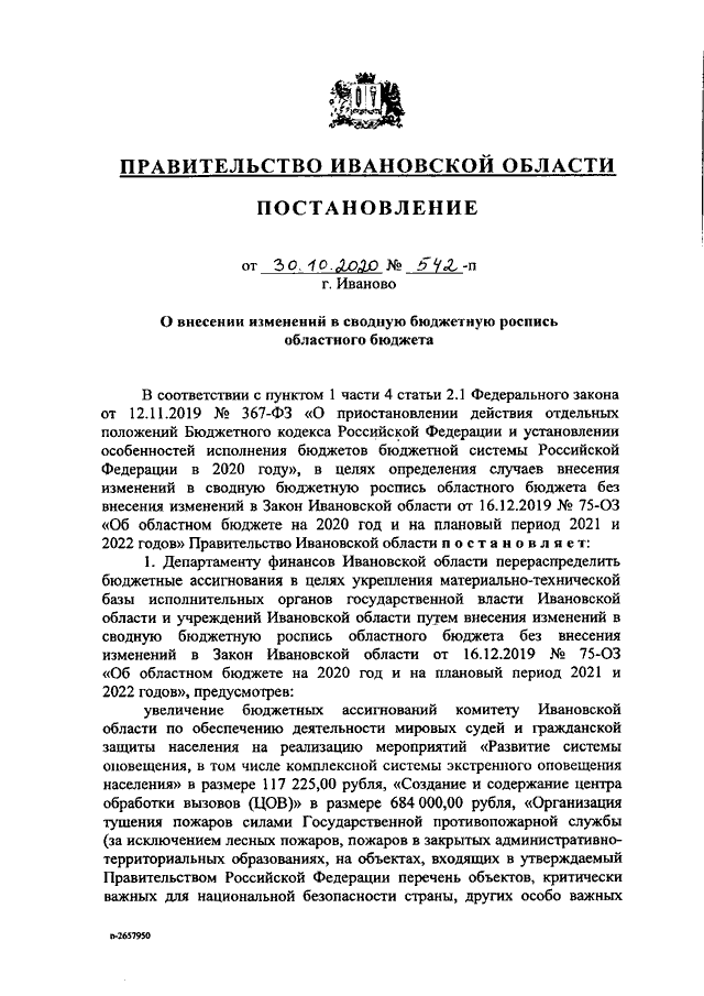Постановление Правительства Ивановской области от 30.10.2020 N 542-п "О внесении изменений в сводную бюджетную роспись областного бюджета"