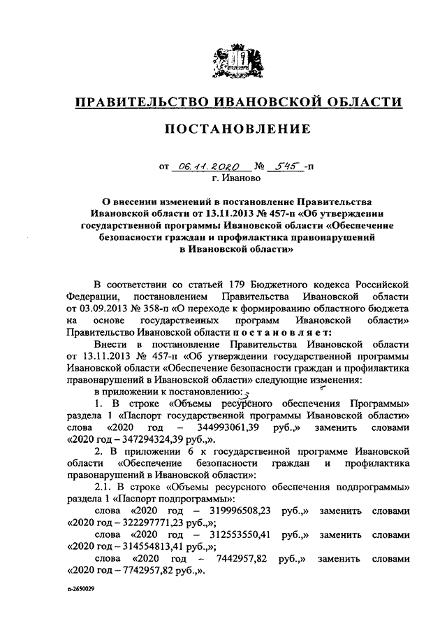 Постановление Правительства Ивановской области от 06.11.2020 N 545-п "О внесении изменений в постановление Правительства Ивановской области от 13.11.2013 N 457-п "Об утверждении государственной программы Ивановской области "Обеспечение безопасности граждан и профилактика правонарушений в Ивановской области"