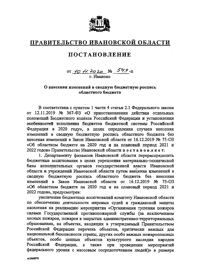 Постановление Правительства Ивановской области от 10.11.2020 N 549-п "О внесении изменений в сводную бюджетную роспись областного бюджета"