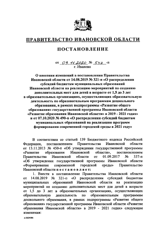 Постановление Правительства Ивановской области от 09.11.2020 N 547-п "О внесении изменений в постановления Правительства Ивановской области от 14.08.2019 N 321-п "О распределении субсидий бюджетам муниципальных образований Ивановской области на реализацию мероприятий по созданию дополнительных мест для детей в возрасте от 1,5 до 3 лет в образовательных организациях, осуществляющих образовательную деятельность по образовательным программам дошкольного образования, в рамках подпрограммы "Развитие общего образования" государственной программы Ивановской области "Развитие образования Ивановской области" в 2019 - 2021 годах" и от 07.10.2020 N 490-п "О распределении субсидий бюджетам муниципальных образований на реализацию программ формирования современной городской среды в 2021 году"