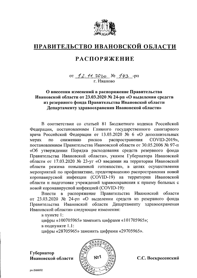 Распоряжение Правительства Ивановской области от 12.11.2020 N 143-рп "О внесении изменений в распоряжение Правительства Ивановской области от 23.03.2020 N 24-рп "О выделении средств из резервного фонда Правительства Ивановской области Департаменту здравоохранения Ивановской области"