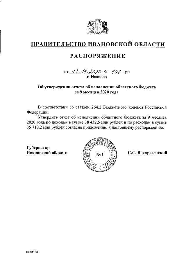Распоряжение Правительства Ивановской области от 12.11.2020 N 146-рп "Об утверждении отчета об исполнении областного бюджета за 9 месяцев 2020 года"