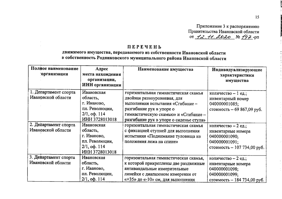Распоряжение Правительства Ивановской области от 12.11.2020 N 147-рп "О передаче движимого имущества из собственности Ивановской области в собственность муниципальных образований Ивановской области"