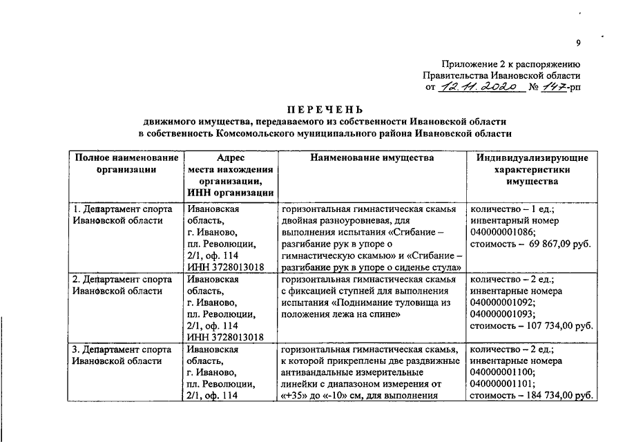 Распоряжение Правительства Ивановской области от 12.11.2020 N 147-рп "О передаче движимого имущества из собственности Ивановской области в собственность муниципальных образований Ивановской области"
