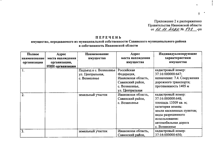 Распоряжение Правительства Ивановской области от 12.11.2020 N 148-рп "О передаче из муниципальной собственности Лухского городского поселения Лухского муниципального района и Савинского муниципального района в собственность Ивановской области автомобильных дорог и о внесении изменений в распоряжение Правительства Ивановской области от 02.07.2008 N 222-рп "Об утверждении перечня автомобильных дорог общего пользования регионального или межмуниципального значения Ивановской области"
