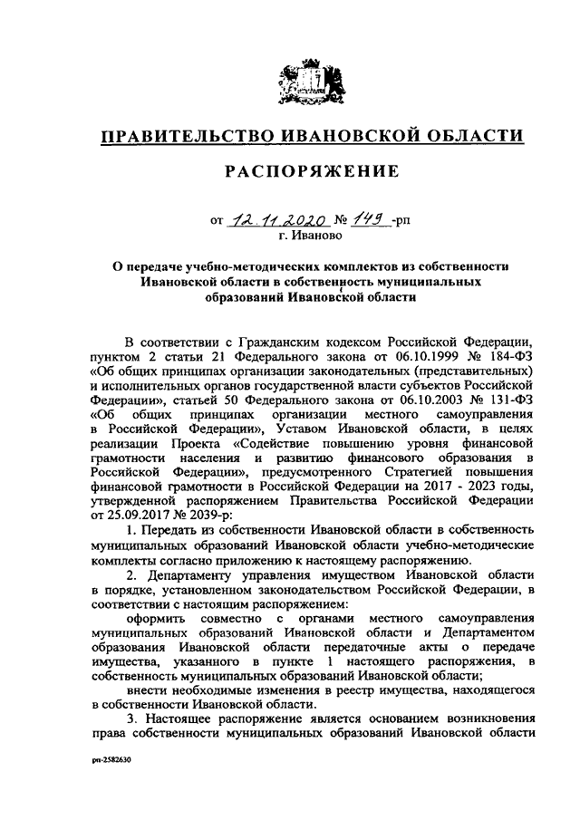 Распоряжение Правительства Ивановской области от 12.11.2020 N 149-рп "О передаче учебно-методических комплектов из собственности Ивановской области в собственность муниципальных образований Ивановской области"