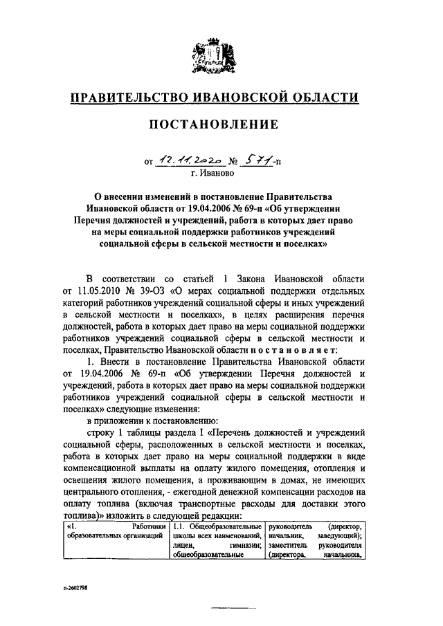 Постановление Правительства Ивановской области от 12.11.2020 N 571-п "О внесении изменений в постановление Правительства Ивановской области от 19.04.2006 N 69-п "Об утверждении Перечня должностей и учреждений, работа в которых дает право на меры социальной поддержки работников учреждений социальной сферы в сельской местности и поселках"